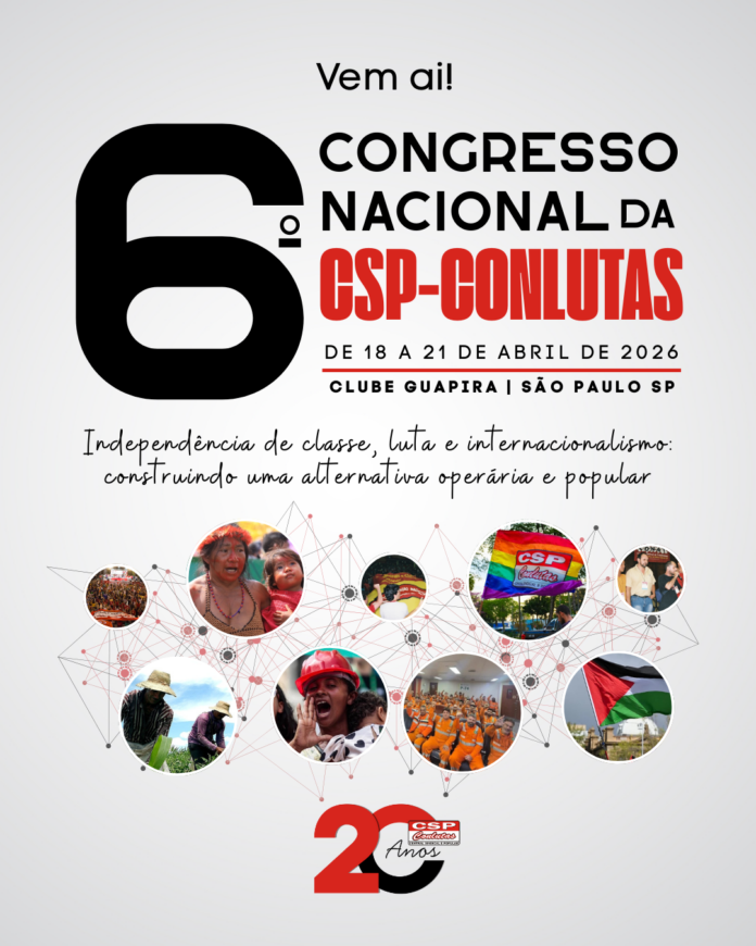 A Central Sindical e Popular CSP-Conlutas realizará, entre os dias 18 a 21 de abril de 2026, em São Paulo, o seu 6º Congresso Nacional, em um momento simbólico: o ano em que a entidade completa 20 anos de existência. O congresso é a principal instância de deliberação da Central e reunirá delegados e delegadas eleitos nas bases sindicais, movimentos populares e organizações filiadas de todo o país.